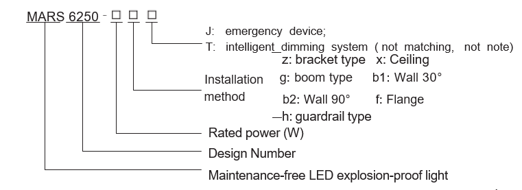 For example: if 30W explosion-proof lamps are required, the product model specification is: